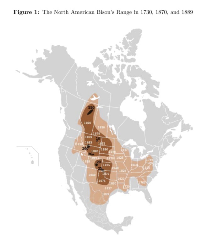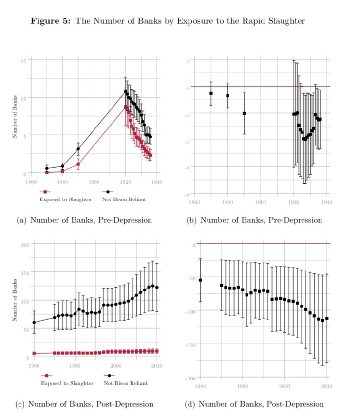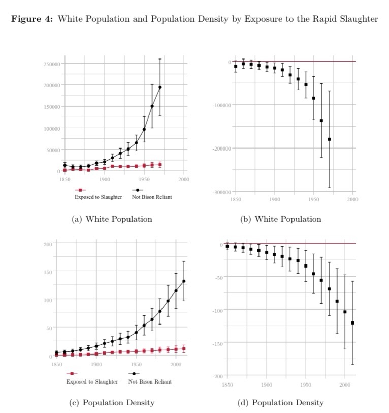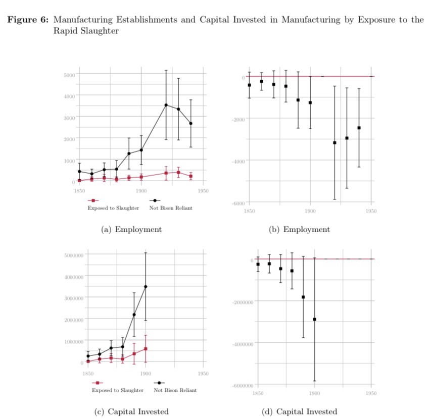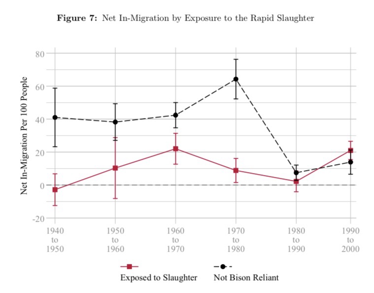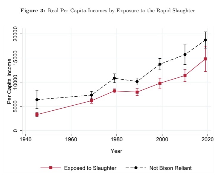 “In the late nineteenth century, the North American bison was brought to the brink of extinction in just over a decade. We demonstrate that the loss of the bison had immediate, negative consequences for the Native Americans who relied on them and ultimately resulted in a permanent reversal of fortunes. Once amongst the tallest people in the world, the generations of bison-reliant people born after the slaughter lost their entire height advantage. By the early twentieth century, child mortality was 16 percentage points higher and the probability of reporting an occupation 29.7 percentage points lower in bison nations compared to nations that were never reliant on the bison. Throughout the latter half of the twentieth century and into the present, income per capita has remained 28 percent lower, on average, for bison nations. This persistent gap cannot be explained by differences in agricultural productivity, self-governance, or application of the Dawes Act. We provide evidence that this historical shock altered the dynamic path of development for formerly bison-reliant nations. We demonstrate that limited access to credit constrained the ability of bison nations to adjust through respecialization and migration.”