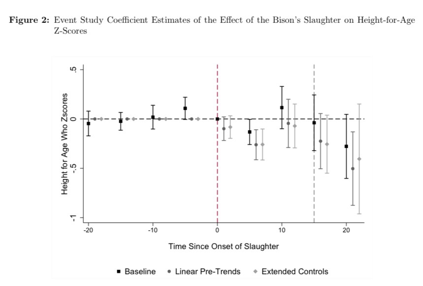 “Figure 2” describes how the bison-reliant tribes suffered a loss of 2.5 cm in height compared to tribes who weren’t. To show that these changes happened as a consequence of the bison slaughter, they merged their bison-reliant data with data on height, gender, and age of over 15,000 Native Americans collected between 1889 and 1903. Other health effects were found to be higher mortality rates in children, and skewed sex ratios, which they indicated being due to maternal deprivation and depression.